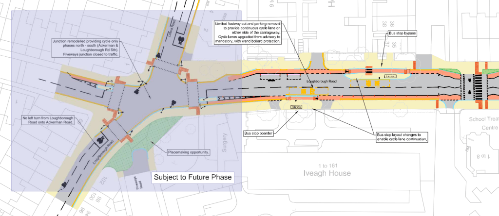 - Cycle traffic lights to be added at Akerman Road and Loughborough Road at the Fiveways Junction